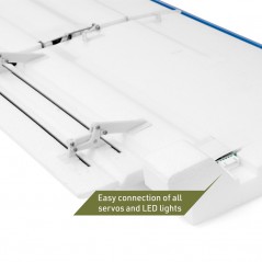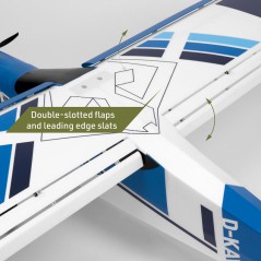 Maqueta a escala (1600 mm de envergadura) de un avión STOL checo-italiano de turismo de aventura, casi listo para volar. Fabricado en poliolefina expandida reforzada con carbono (EPO); motor sin escobillas KAVAN C3548-800, hélice tripala de 10x6", ESC R-50SB Plus y 6 microservos instalados. Control completo de alerones, flaps (con slats acoplados), timón de profundidad, timón de dirección y acelerador; rueda de cola orientable, luces LED. Para batería LiPo 4S de 2600–3300 mAh (al menos 30 C).