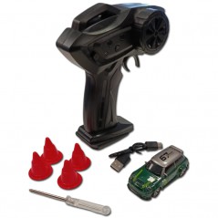 Coche tamaño micro para derrapar su control es con emisora en 2,4Ghz con batería de lipo interna de 3.7V recargable con USB tipo C también incluido, ademas enciende las luces delanteras y trasera e incluye 4 conos para demostrar y perfeccionar sus habilidades